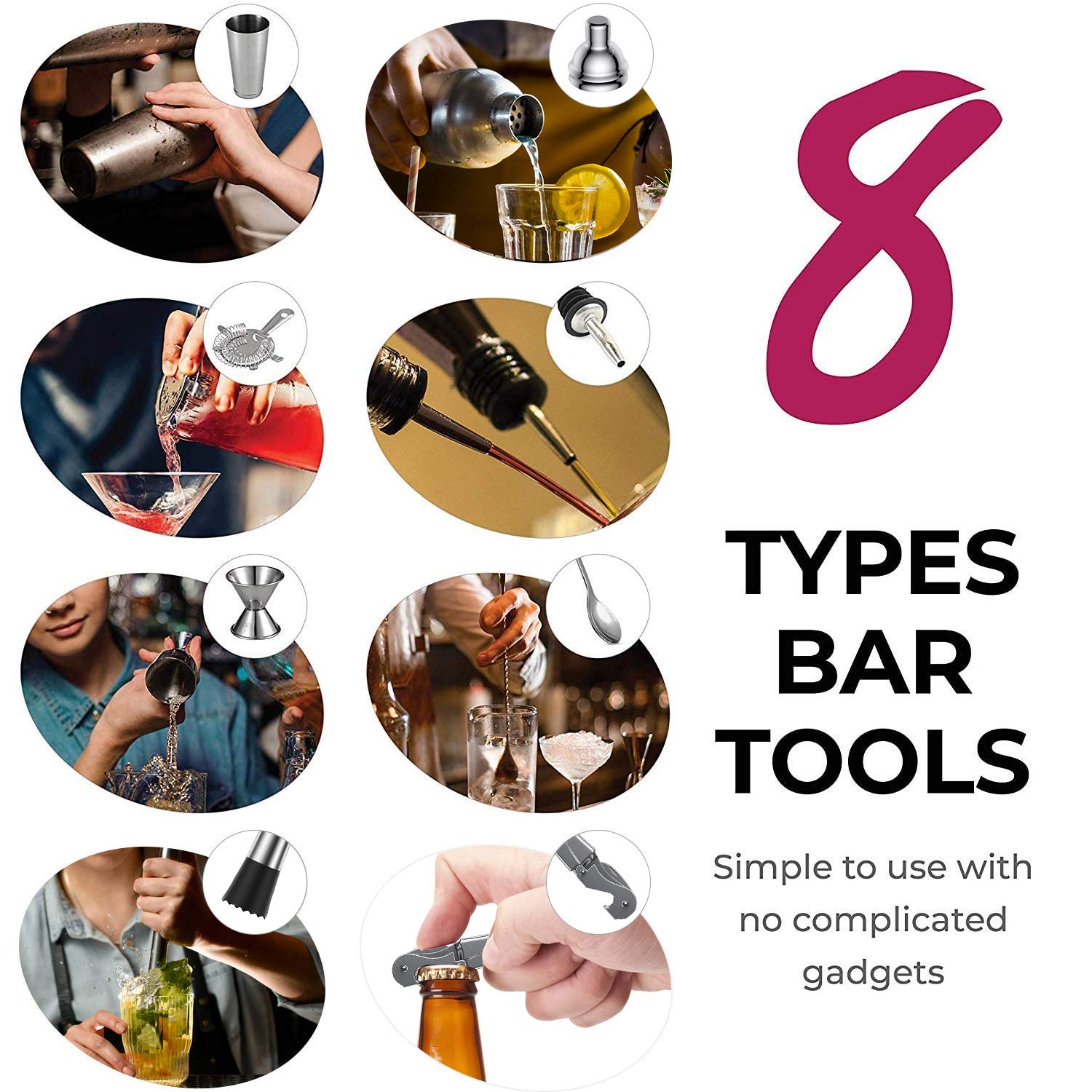 - COMPLETE COCKTAIL SHAKER SET 10-Piece stainless steel bartender set contains most essential bartending tools needed for start mixing yummy drinks. Set includes 1*550ml martini shaker, 1*double jigger, 1*bar spoon, 1*muddler, 1*strainer, 1*ice tongs, 2* liquor pourers, 1*corkscrew and 1*bamboo wood stand.